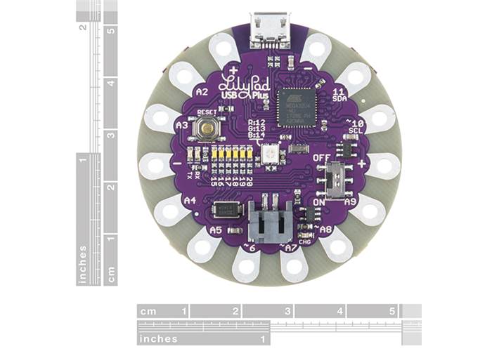 This is the LilyPad USB Plus, a sewable electronics microcontroller board controlled by an ATmega32U4 with the Arduino bootloader. It has a built in power supply JST (and recharge circuit) and an on/off switch with the only extra piece of hardware you need to program the LilyPad USB Plus being a micro-USB cable. We’ve also added an RGB LED in the dead-centre of the board along with six white LEDs to act as a sort of bar graph. The LilyPad USB Plus was designed to streamline your next sewable project by keeping things simple and giving you more room to work while eliminating the need to sew a power supply.
