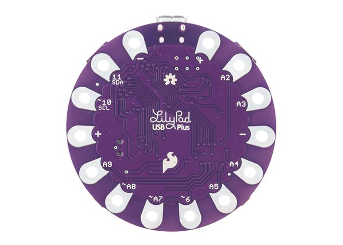 It has fourteen sew tabs for connecting components with conductive thread. Four of these tabs are reserved for connecting power and ground of LilyPad sensors and accessory boards, and ten are input/output (I/O). For reference, each sew tab has a nearby label with its name and the pin number it is connected to on the ATmega32U4 chip at its centre.