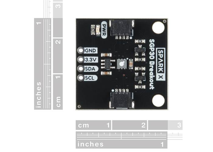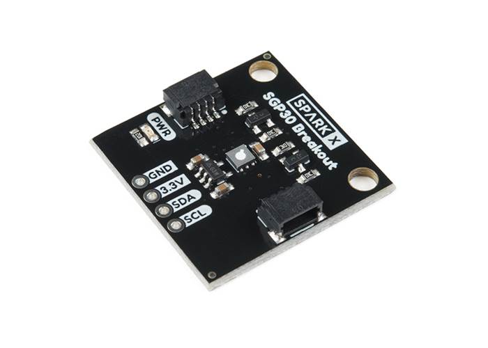 The SGP30 is an indoor air quality sensor equipped with an I 2 C interface. It outputs equivalent CO 2 in ppm and Total Volatile Organic Compounds (TVOC) in ppb. The sensor also gives access to its raw measurement values of Ethanol and H 2 . The SGP30 boasts high stability with low long term drift.