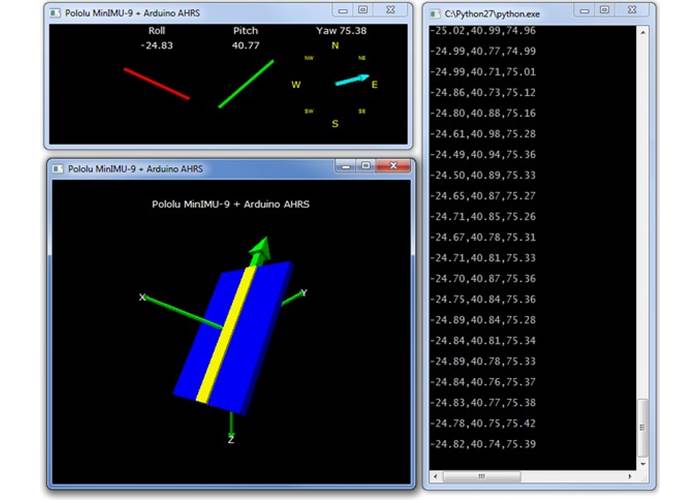 For a demonstration of what you can do with this data, you can turn an Arduino connected to a MinIMU-9 into an attitude and heading reference system, or AHRS, with this Arduino program. It uses the data from the MinIMU-9 to calculate estimated roll, pitch, and yaw angles, and you can visualize the output of the AHRS with a 3D test program on your PC (as shown in a screenshot above). This software is based on the work of Jordi Munoz, William Premerlani, Jose Julio, and Doug Weibel.