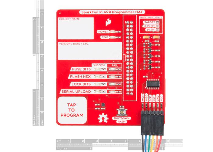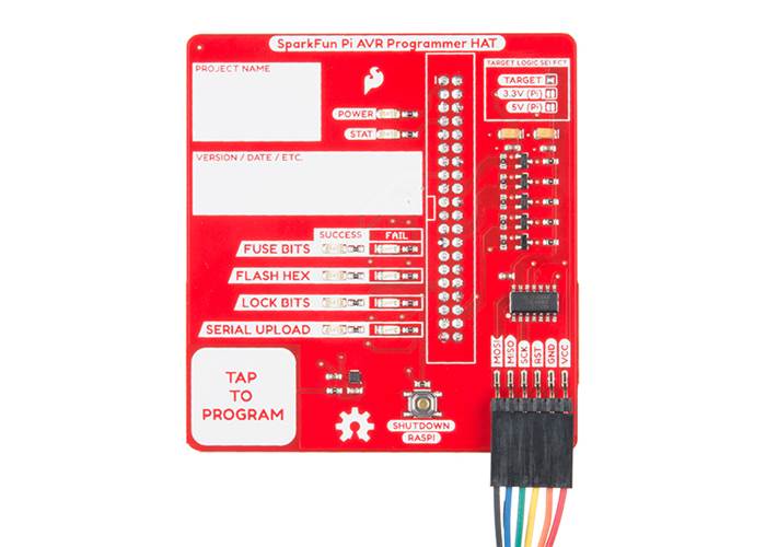 The SparkFun Pi AVR Programmer HAT plugs directly into the GPIO port on your Raspberry Pi and provides multiple unique amenities onboard including (but not limited to) a capacitive touch pad to engage programming, multiple Pass / Fail status LEDs, an isolation switch, and label boxes to keep track of your projects. Also included with each HAT is a 1x6 hookup cable that connects to the programmer’s ISP header, and an ISP interface adaptor equipped with a 2x3 header. Programming an AVR through an in-system programmer (ISP) can provide many benefits including a faster code upload rate, the ability to overwrite the bootloader and gain a bit more flash space, and a way to influence the fuse bits to change a multitude of settings on your target.