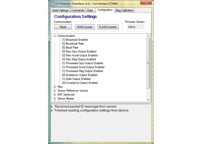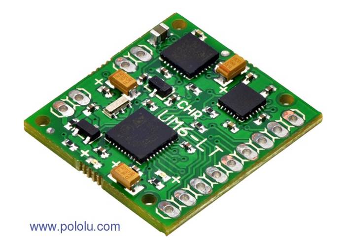 The UM6-LT ultra-miniature orientation sensor—also known as an Attitude and Heading Reference System, or AHRS—from CH Robotics is an OEM version of their UM6 orientation sensor. Like the UM6, it uses rate gyros, accelerometers, magnetic sensors, and an on-board 32-bit ARM Cortex processor to estimate the absolute sensor orientation 1000 times per second. Sensor orientation is reported using either quaternions or Euler angles over a TTL serial interface at user-customizable rates. A USB-to-serial adapter can be used to connect the IMU to a computer running the free CH Robotics Serial Interface PC application, which allows for easy data visualization, board calibration, and UM6-LT settings configuration.