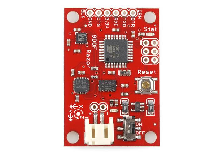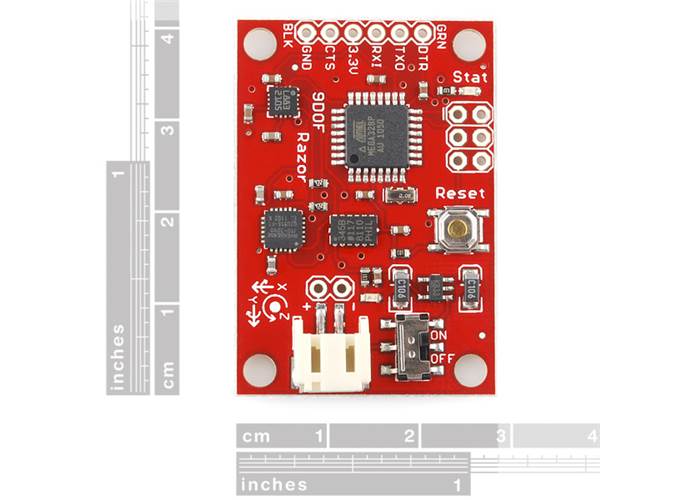 The 9DOF Razor IMU incorporates three sensors - an ITG-3200 (triple-axis gyro), ADXL345 (triple-axis accelerometer), and HMC5883L (triple-axis magnetometer) - to give you nine degrees of inertial measurement. The outputs of all sensors are processed by an on-board ATmega328 and output over a serial interface.