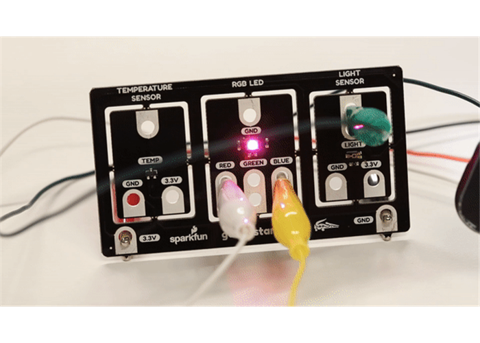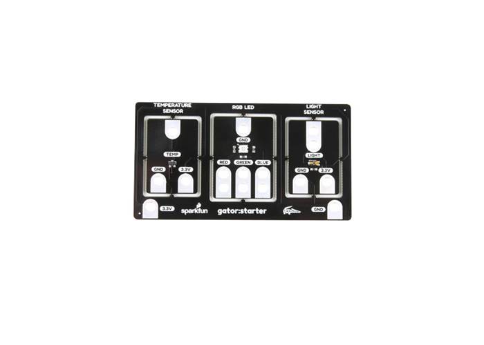 Included on each gator:starter is a temperature sensor board, a light sensor board and an RGB LED board. Since this is a ProtoSnap, we’ve broken out the power so it can be clipped to on the edge of the gator:starter to power the board without breaking each individual sensor or LED. Snapping the board apart can be easily done by twisting each of the LED boards side to side until it pops out and will need to be done if you want to light any of the LEDs on their own.
