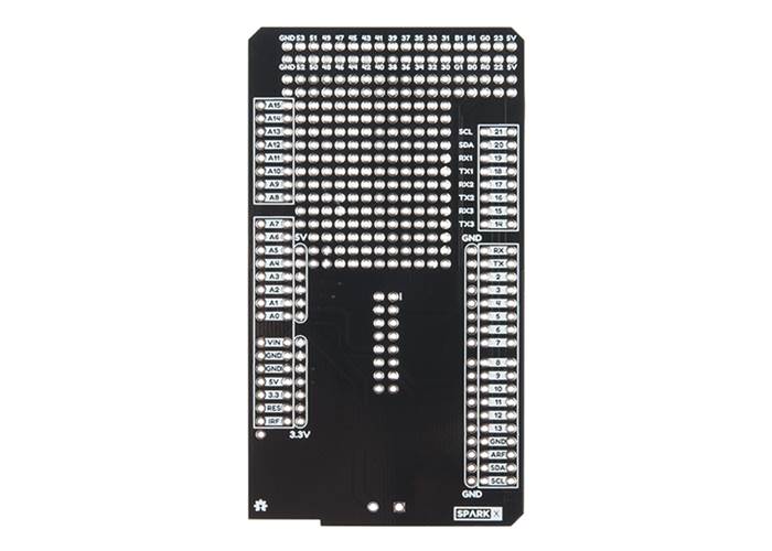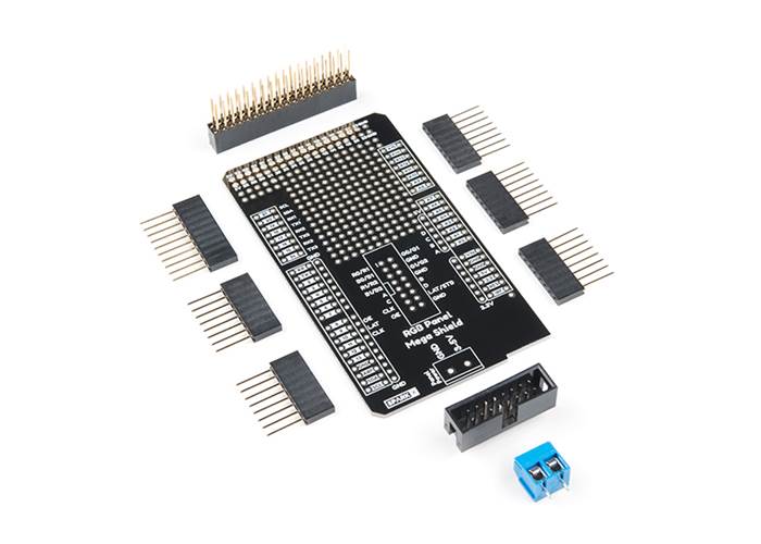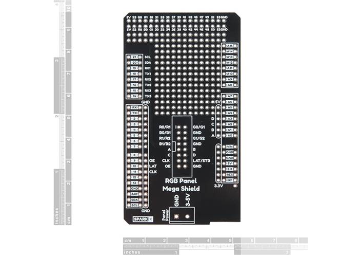 This shield was designed to leverage the power and memory space of the Mega. It is guaranteed to work with our 32x32 RGB panel and our 32x64 RGB panel but has been designed to work with nearly all 32x32 and 32x64 pixel panels available on the market.