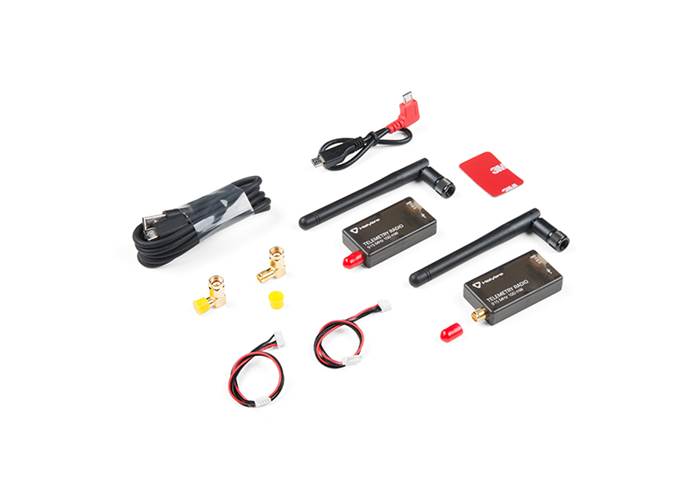 This telemetry kit includes two radio modules, USB cable, Android adaptor cable, two JST-GH cables, two right-angled RP-SMA connectors, and two 915MHz antennae. Each radio module in the kit features a transmit power of 100mW, a RX sensitivity of -117dB, a full duplex transparent serial link of 57600baud and are equipped with a micro USB and UART port for easy connectivity.