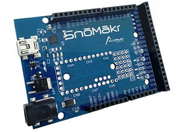 SnōMākr is a breakout board for Alorium Technology’s Snō FPGA Module. This board makes prototyping with Snō quick and efficient by providing convenient access to signal I/O in a familiar layout. SnōMākr is compatible with 3.3V Arduino shields, and designers can still access the additional 18 Snō digital signal pins when a shield is being used. The on-board FTDI driver and voltage regulators allow connectivity with existing mini-USB cables and power adapters used for XLR8, Arduino Uno, or other development platforms.