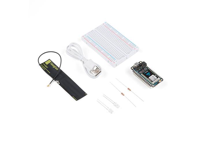 This LTE IoT development kit from Particle includes the Boron LTE development board, a breadboard, a cellular flex antenna, and a USB cable. The starter project includes two resistors of 220Ω, one red LED, and one photodiode.