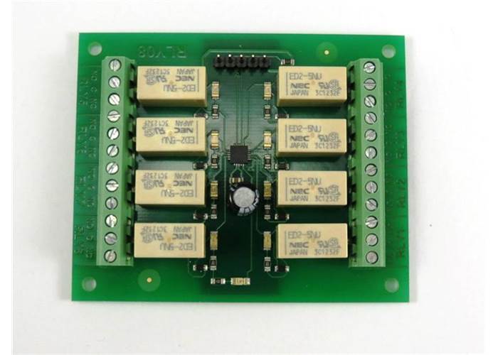 The RLY08 provides eight volt free contact relay outputs with a current rating of up to 1Amp each. The board is controlled via I2C or TTL Serial interfaces making it perfect for use with microcontrollers. Up to eight modules can be connected together via the serial or I2C bus for controlling up to 64 relays from the one microcontroller.