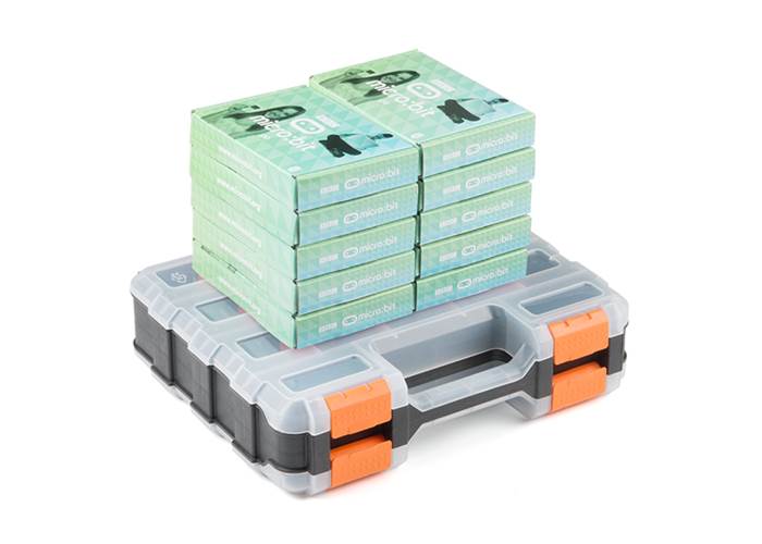 This product is a special kit developed in partnership between CodeFWD by Facebook and SparkFun. It contains 10 micro:bit Go Bundles and an adjustable storage case.