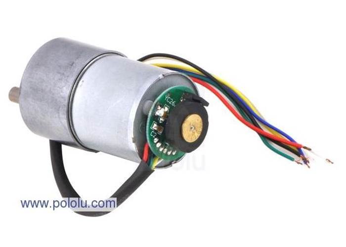 A two-channel Hall effect encoder is used to sense the rotation of a magnetic disk on a rear protrusion of the motor shaft. The quadrature encoder provides a resolution of 64 counts per revolution of the motor shaft. To compute the counts per revolution of the gearbox output, multiply the gear ratio by 64. The motor/encoder has six color-coded, 11" (28 cm) leads: