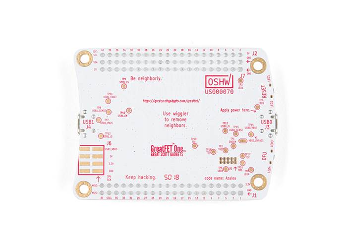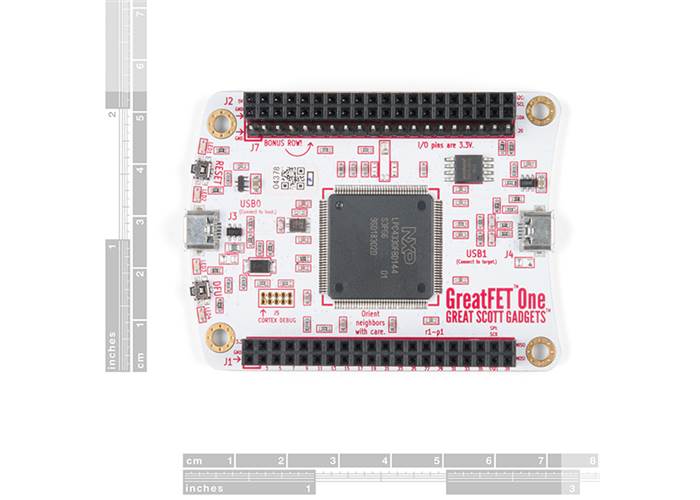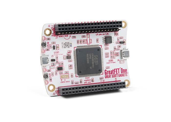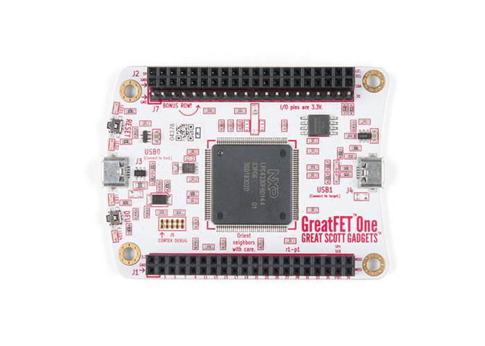 The GreatFET One from Great Scott Gadgets is a hacker's best friend! With two USB ports, one host and one peripheral, it can act as a "man in the middle" for USB interfacing. The GreatFET One connects to a host computer and extends the reach of said computer to the outside world. Whether you need an interface to an external chip, a logic analyser, a debugger, or just a whole lot of pins to bit-bang, the versatile GreatFET One is the tool for you. Hi-Speed USB and a Python API allow GreatFET One to become your custom USB interface to the physical world. With an extensible, open source design, two USB ports and 100 expansion pins, GreatFET One is your essential gadget for hacking, making and reverse engineering.