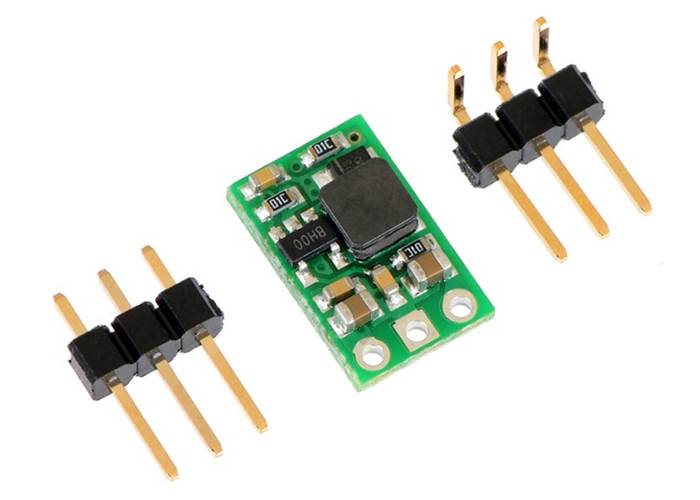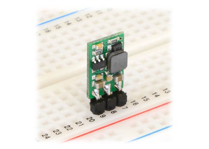 The compact (0.32"×0.515") U3V12F5 switching step-up (or boost) voltage regulator takes an input voltage as low as 2.5 V and efficiently boosts it to 5 V at approx. 600mA. The pins have a 0.1" spacing, making this board compatible with standard solderless breadboards and perfboards.