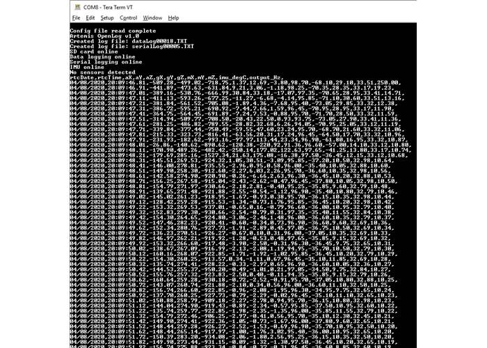 OpenLog Artemis is highly configurable over an easy to use serial interface. Simply plug in a USB C cable and open a terminal at 115200bps. The logging output is automatically streamed to both the terminal and the microSD. Pressing any key will open the configuration menu.