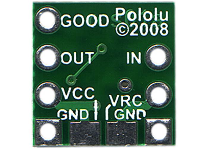 The board has two outputs, each of which is capable of sourcing or sinking 20 mA. The primary output, OUT, goes high (on) when a valid signal is detected and the pulse width is above the threshold of 1.6 ms. There is approximately ±0.1 ms of hysteresis on the threshold, meaning that the pulse width will have to get to approximately 1.7 ms before the output turns on, and once on, the signal will have to fall below 1.5 ms to turn off. A secondary output, GOOD, can be used to indicate the presence of a valid RC signal (10-100 Hz pulse rate, 0.5-2.5 ms pulse width).