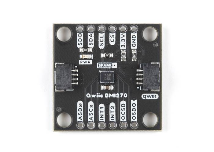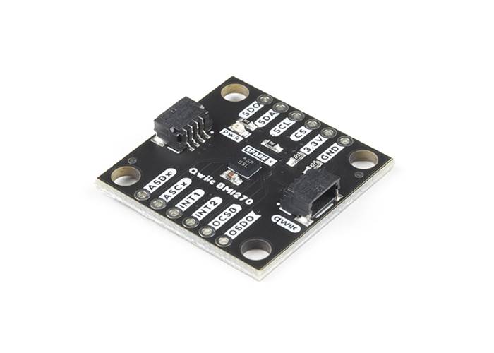 Our Qwiic BMI270 IMU Breakout makes it easy to add this sensor to your project using our solderless Qwiic cables and compatible controllers. If you still prefer to use a breadboard, don't worry, we've still broken out all IO pins to 0.1" spaced pin-headers along the sides of the board. On-board solder jumpers allow you to easily select the device address, remove the I²C pull-ups, and disable the power LED if need be.