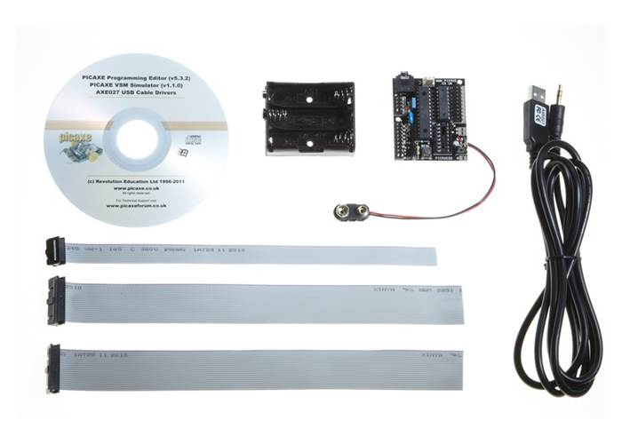 The 'starter pack' includes both the project board, download cable and a battery box. The software needed is free, so all extra you need to get started, is a computer and batteries. Furthermore, free training resources and tutorials are provided in the PICAXE manual (Part 1 - Getting Started).