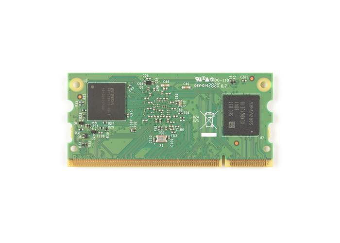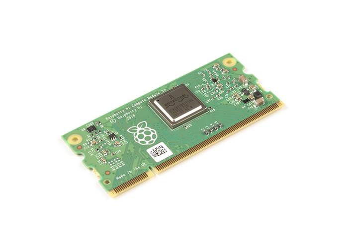 The Raspberry Pi Compute Module 3+ contains the guts of a Raspberry Pi 3 Model B+ (the BCM2837 processor and 1GB LPDDR2 RAM) with 32GB of eMMC Flash memory. This module allows a designer to leverage the Raspberry Pi hardware and software stack in their own custom systems and form factors.