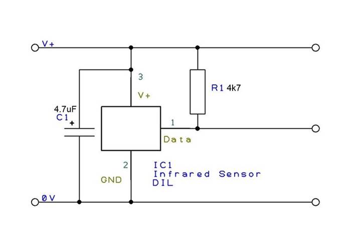 Infrared sensor (infra red sensor- infra-red sensor- IR sensor). For use with PICAXE circuits to detect infra-red signals from a TV style remote control or another PICAXE chip. 2.7V to 5.5V operation.