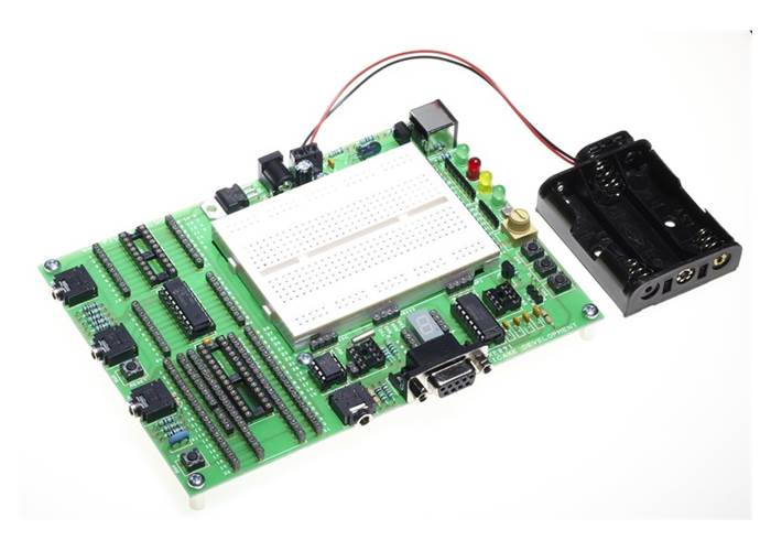 The board can be powered via batteries (battery box included), or an external power supply (sold separately), and the board has on-board regulated power supply, with LED power indicator.