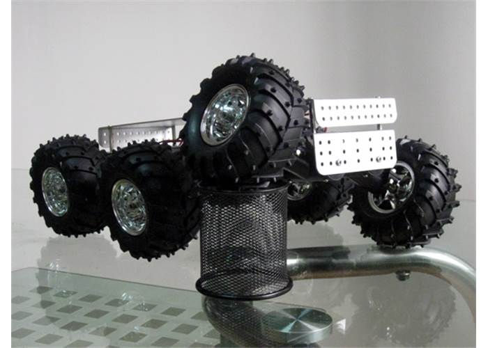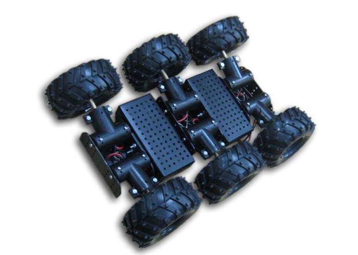 Each of the six motors are mounted on independent suspension and outfitted with 34:1 steel gearboxes (no more stripped gears!). The motors are wired together on a terminal strip inside the 2mm thick anodized metal frame and can be controlled on two channels (left and right). The entire chassis is perforated with 10mm pitched, 4mm diameter mounting holes and there is plenty of room interior to the chassis for batteries, drivers and other support hardware. The chassis comes with 6 of those gnarly Dagu 120mm off-road wheels.