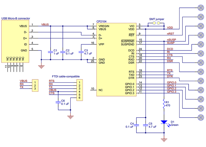 You do not need to be familiar with details of the CP2104 to use this board as a basic USB-to-serial adapter, but the CP2104 also has specialized features including four general-purpose I/O (GPIO) pins and the ability to be customized via its one-time programmable ROM. For advanced users interested in these features, we recommend careful reading of the CP2104 datasheet (224k pdf). Additional resources, including application notes referenced by the datasheet, can also be found on the CP21xx product page of the Silicon Labs website.