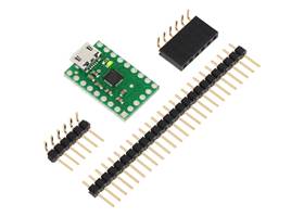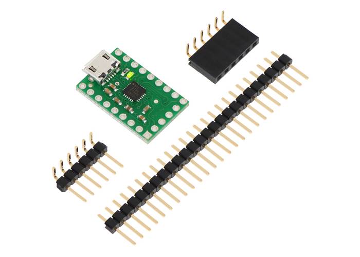 The carrier board ships with a 1×25 straight male header strip, a 1×6 right-angle male header strip, and a 1×6 right-angle female header as shown below. You can also solder wires directly to the pads for the smallest installation.