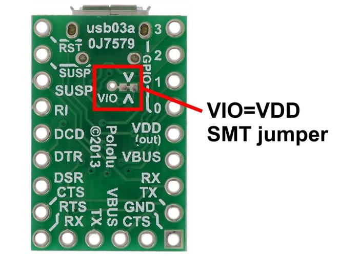 This carrier board connects the VIO pin of the CP2104 to VDD by default, setting its logic voltage level to the 3.45 V provided by the IC’s built-in voltage regulator. If you want to use a lower logic voltage, you can disconnect VIO from VDD by cutting the thin trace between the two pads of the surface-mount jumper shown to the right. You can then solder a thin wire to the exposed via labeled “VIO” and connect it to a separate voltage supply (as low as 1.8 V).