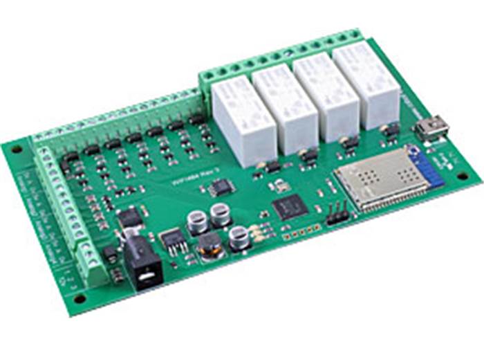 The "WIFI484" allows you to control 4, 16-Amp relays over an Wifi connection using a built in web page or via simple TCP/IP based commands. An additional 4 analoge and 8 digital IO pins allow connection of other devices. Screw terminals on normally open, normally closed and common relay pins allow for easy connection.