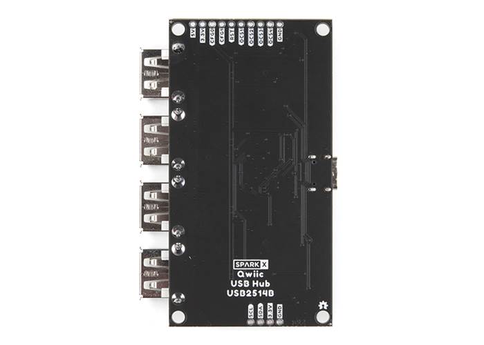 The Qwiic USB Hub is a simple breakout board for the USB2514B USB hub IC. What gives it extra flair is the ability to configure the device over I2C. Out of the box, the board will appear as a standard USB 2.0 Hub; no configuration necessary. Closing the I2C jumper will put the device into configuration mode. We've got an Arduino Library to help you set the various parameters of the hub including VID/PID, downstream max current, even language ID and product names.