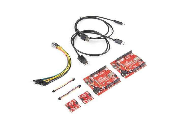 Also included with this kit is a pair of SparkFun RedBoard Artemis boards. Think of the RedBoard Artemis as just another Arduino but one that has BLE, one megabyte of flash, and runs at less than 1mA. The RedBoard Artemis takes the incredibly powerful Artemis module from SparkFun and wraps it up in an easy to use and familiar Uno footprint. Along with the SparkFun Original boards, you will receive two reversible USB A to C cables, two 50mm flexible Qwiic cables, and a pack of 10 M/M jumper wires.