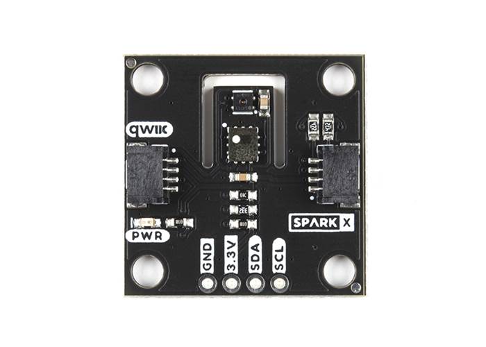As usual, our board includes a power LED, a pair of Qwiic connectors, I2C breakout pads and pull-up resistors. You can disable the LED and pull-ups if you need to by cutting the I2C jumpers on the back of the board.