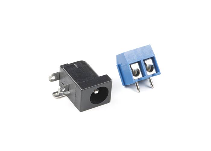 The DC Barrel Jack comes with the kit but the input footprint will also allow for a 2-Pin screw terminal so if you don't need a DC barrel for the input you can pick up an extra screw terminal and solder it instead.