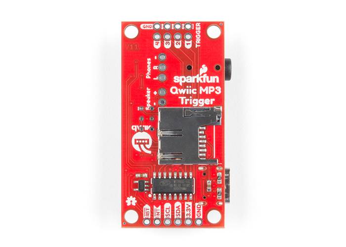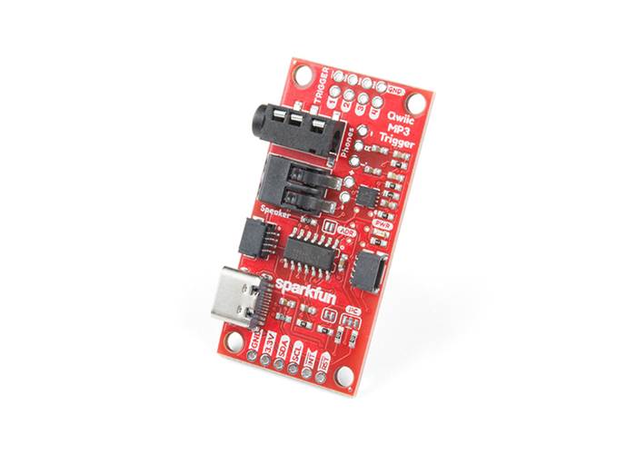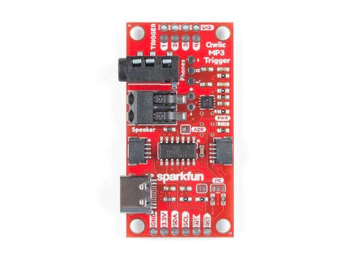 When a USB-C cable is connected to the Qwiic MP3 Trigger the contents of the microSD card appears as a jump drive. Simply plug in the Qwiic MP3 Trigger and you'll be transferring MP3s, no need for drivers and no need for WAV or Vorbis conversion! Sound output is provided via a 3.5mm headphone jack or poke-home connector allowing an external speaker to be connected without soldering. Your supplied speaker is boosted by a Class-D mono amplifier capable of outputting up to 1.4W making it capable of being incredibly loud! Volume is software selectable between 32 levels while equalization can be tuned to be sure your classical hits sound different from your jazz dance routines. If you don't want to deal with any programming, there are four trigger pins. When pin 3 is pulled low the T003.mp3 file will immediately be played. This allows you to start playing sound effects with the touch of a button! By pulling multiple pins down simultaneously the four triggers can play up to ten tracks: T001 to T010. Up to 255 tracks can be loaded onto the SD card and triggered via the I2C interface.