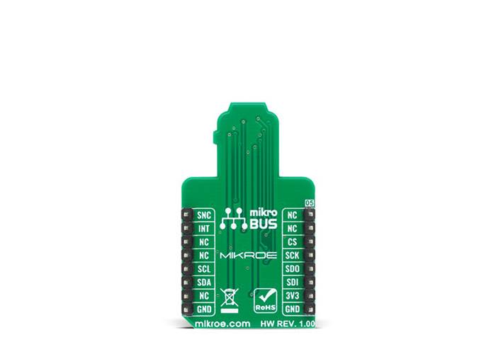 The ICM-42688-P has a programmable interrupt system that can generate an interrupt signal. There are two interrupt outputs in which one of them represents frame synchronisation input routed to the PWM pins on the mikroBUS™. An interrupt can be triggered while switching clock sources, when new data is available for reading (from the FIFO and data registers), during accelerometer events, FIFO watermark and overflow.