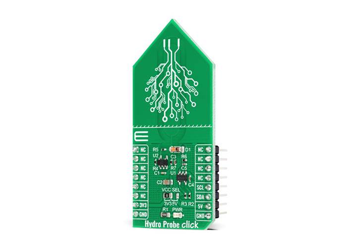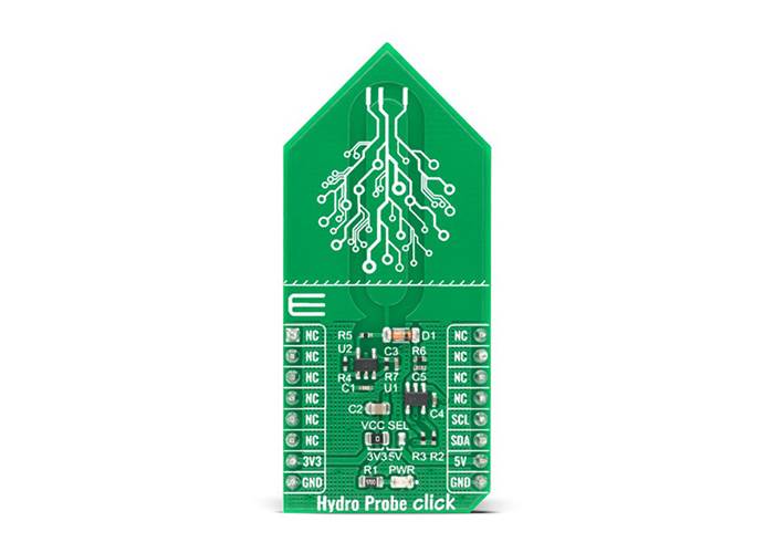 MIKROE Hydro Probe Click is a capacitive soil moisture sensor based on capacitive changes that are used to detect the volumetric water content in the soil.