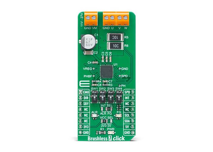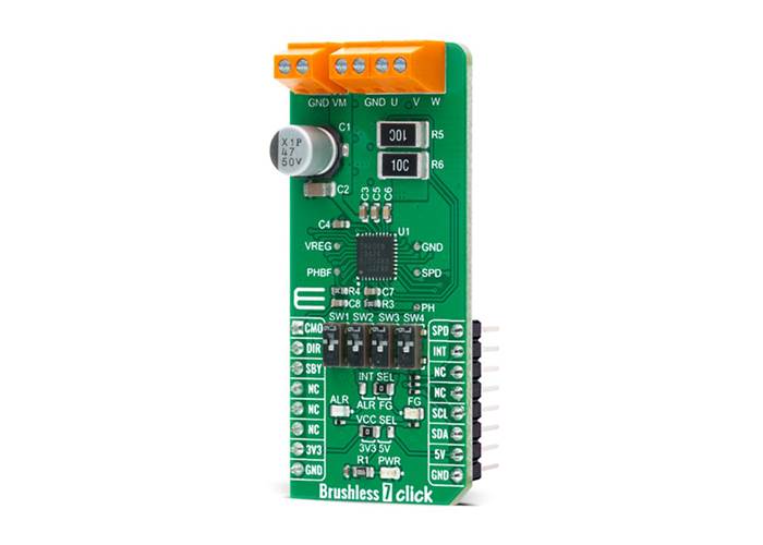 MIKROE Brushless 7 Click is, as its name said, a motor driver based expansion board for controlling BLDC motors with any microcontroller. The board is based on TC78B009FTG IC from Toshiba, which is a three-phase BLDC motor controller that does not require Hall sensors. Some of the main features are a built-in closed loop speed control function that regulates and maintains the motor rotational speed under dynamic power fluctuations and load variations. With precise setting of a speed profile done by the built-in nonvolatile memory (NVM) it eliminates the need for an external MCU for closed loop speed control and makes it perfect solution for applications that include high-speed fans used in servers, blowers, cordless vacuum cleaners, and robot vacuum cleaners.