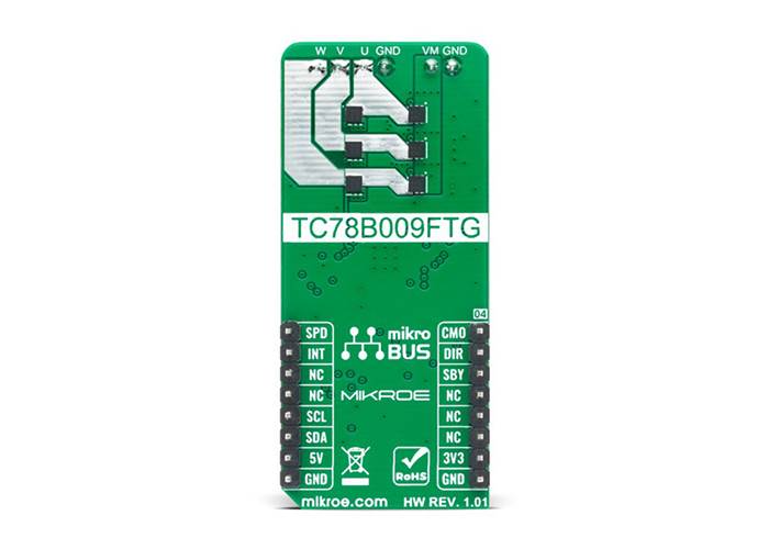 MIKROE Brushless 7 Click is, as its name said, a motor driver based expansion board for controlling BLDC motors with any microcontroller. The board is based on TC78B009FTG IC from Toshiba, which is a three-phase BLDC motor controller that does not require Hall sensors.