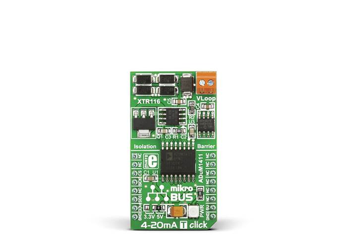 MIKROE 4-20mA T Click is an add-on board in mikroBUS form factor. It’s a compact and easy solution for adding 4-to-20mA industry standard communication protocol to your design. It features ADuM1411 Quad-chanel digital isolator, MCP4921 12-bit DAC as well as XTR116 4-20mA current loop transmitter. 4-20mA T Click™ communicates with target board microcontroller via three mikroBUS™ SPI lines (SDI, SCK, CS). Together with 4-20mA R Click™ this board forms a complete 4-to-20mA current loop standard. The board is designed to use 3.3V and 5V power supply. LED diode indicates the presence of power supply.