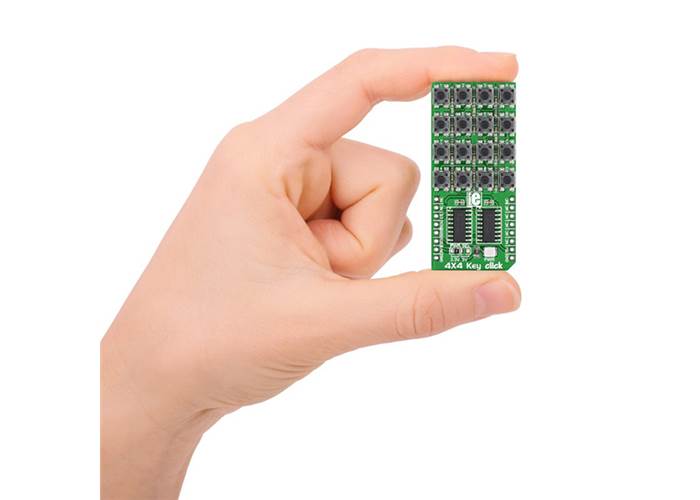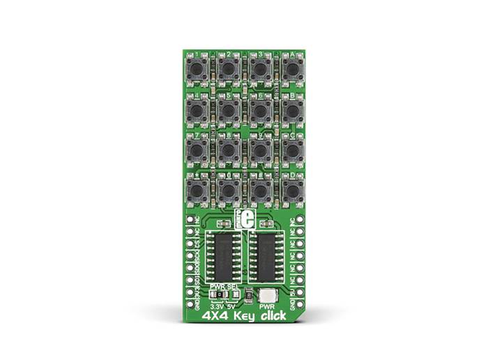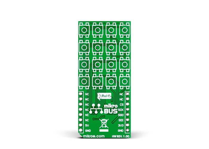 MIKROE 4x4 Key Click carries a 16 button keypad. The design of the board — inputs are read by a pair of connected 8-bit parallel-in serial-out shift registers — allows for multiple key presses at the same time. For ease of use, each button has silkscreen markings.