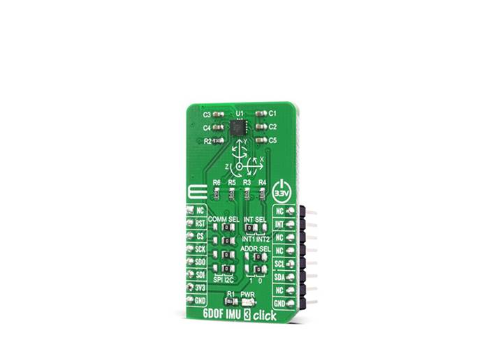 MIKROE 6 DOF IMU 3 Click is a complete 6-axis detection development board suitable for movement and position tracking devices. This Click board features the compact FXOS8700CQ motion sensor from NXP, an integrated 3-axis linear accelerometer and 3-axis magnetometer combined in one package. The device supports selectable I2C or point-to-point SPI serial interface with 14-bit accelerometer and 16-bit magnetometer which are combined with a high-performance ASIC to enable an eCompass solution capable of a typical orientation resolution of 0.1° and sub-5° compass heading accuracy for many applications.