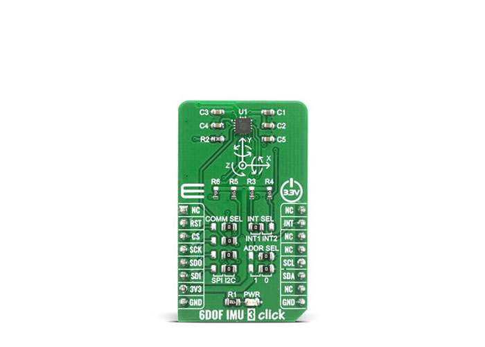 6DOF IMU 3 Click supports both SPI and I2C communication interfaces, allowing it to be used with a wide range of different MCUs. The communication interface can be selected by moving SMD jumpers grouped under the COM SEL to an appropriate position (SPI or I2C). The peripheral I2C address can also be configured by an SMD jumper when the Click board™ is operated in the I2C mode. An SMD jumpers labelled as ADDR SEL is used to set the least significant bit (LSB) of the I2C address. The I2C interface is compliantwith fast mode (400 kHz), and normal mode (100 kHz) I2C standards, while the SPI interface is a classical controller/peripheral serial port. The FXOS8700CQ is always considered as the peripheral and thus is never initiating the communication.