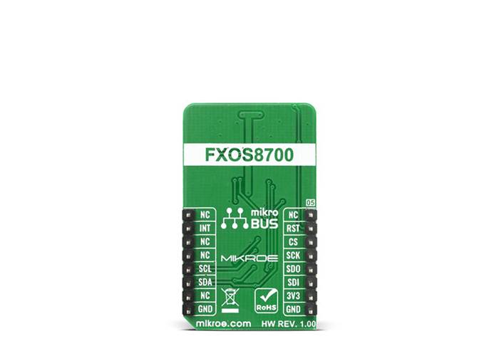 MIKROE 6 DOF IMU 3 Click is a complete 6-axis detection development board suitable for movement and position tracking devices. This Click board features the compact FXOS8700CQ motion sensor from NXP, an integrated 3-axis linear accelerometer and 3-axis magnetometer combined in one package.