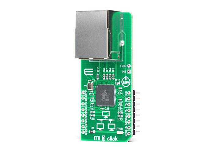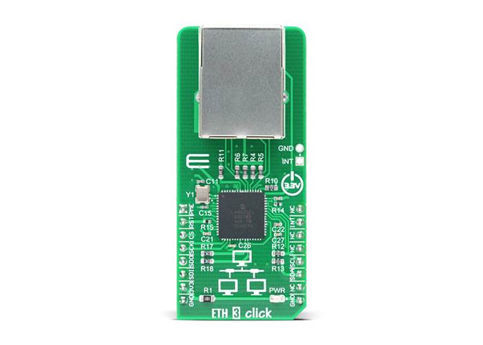 MIKROE ETH 3 Click is a compact add-on board that contains Ethernet Controller & PHY for embedded applications.