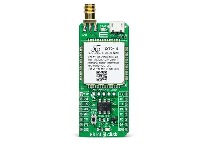 MIKROE NB IoT 5 Click is a compact add-on board suitable as narrow-band Internet of Things universal wireless communication solution. This board features the OT01-5, a high-performance NB-IoT module with ultra-low power consumption allowing battery life of about ten years from Notion. It supports a broad range of frequency bands almost worldwide. It provides serial interfaces, UART and SPI, with protocol stacks such as UDP/TCP, CoAP, LWM2M, and others. It is offering an alternative to similar Low Power Wide Area Network (LPWAN) solutions. This Click board™ is suitable for a wide range of IoT applications such as smart petrol/water meters, information collection, security monitoring, smart city/home, and other applications.