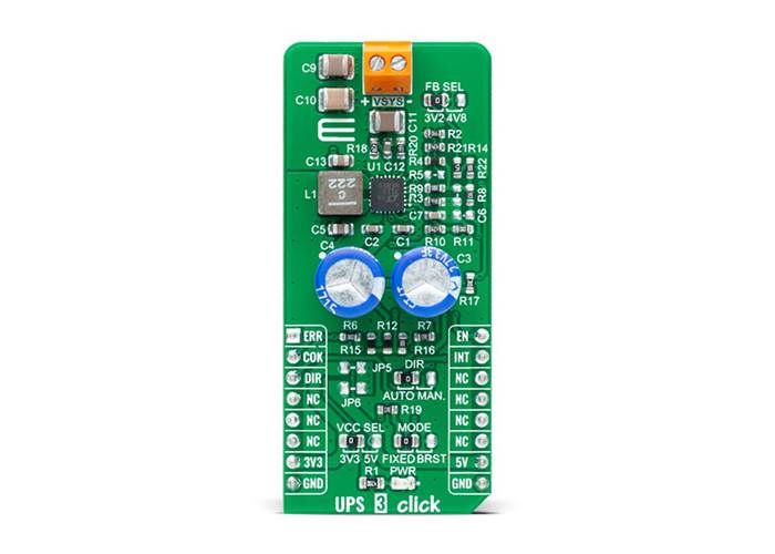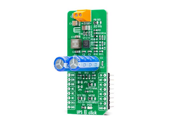 UPS 3 Click as its foundation uses the LTC3110, a bidirectional buck-boost DC/DC regulator with capacitor charger and balancer from Analogue Devices. The buck-boost regulator utilizes a proprietary switching algorithm that allows the system voltage to be regulated above, below, or equal to the voltage on the storage element without discontinuity in inductor current or large voltage ripple in the backup voltage. During charging, a limit for the average current drawn from the system power source is accurately programmed with an external resistor and set to 450mA. It also has an integrated, active voltage balancing buffer that prevents capacitor overvoltage conditions caused by capacitor mismatch while charging a stack of supercapacitors.