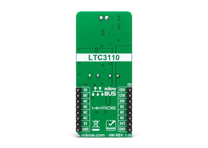 With the DIR pin routed on the CS pin of the mikroBUS™ socket, the LTC3110 can instantly reverse the inductor current and change between Charging and Backup operation modes, reacting quickly on a power failure condition by providing the backup voltage to the system. In combination with the jumper labelled as DIR, this pin allows automatic charging of the supercapacitor when a system voltage is present and works as a DC/DC converter providing system backup power to the load due to lack of system power. Otherwise, users have control overcharging and discharging the supercapacitor manually, changing the DIR pin's logic state.