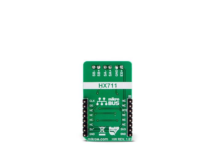 This ADC is based on patented Avia technology, and represents an analogue front-end device which offers all the required elements for building an accurate load cell application: the internal regulator allows powering up both the ADC section and excitation of the load cell, two 24bit differential channels with the low noise programmable gain amplifier with 32, 64, and 128 gain factor, which allow measurement range selection, mains power 50Hz and 60Hz interference rejection, selectable data output frequency up to 80 samples per second (SPS), and a simple serial communication interface. Load Cell click can be used in a wide range of weight measurement applications, but it can be also utilised to measure the strain force applied on shafts, machine parts, and other similar objects, exposed to forces that cause strain.