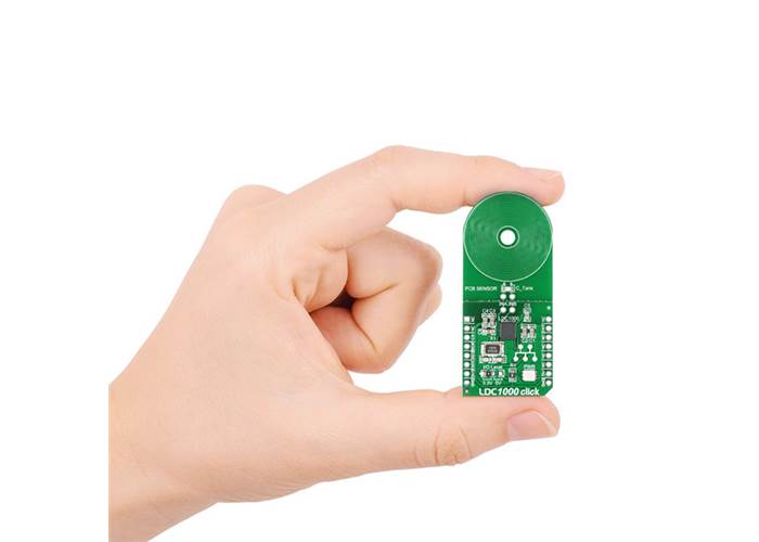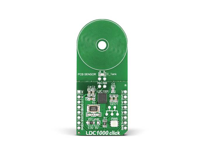 MIKROE LDC1000 Click carries the world's first inductance-to-digital converter IC, along with a detachable sensor (an LC tank comprising a 36-turn PCB coil and a 100pF 1% NPO capacitor).