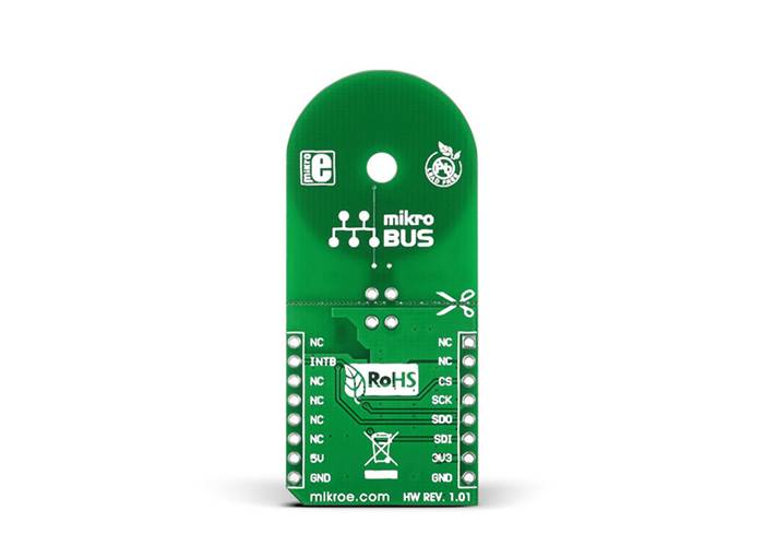 MIKROE LDC1000 Click carries the world's first inductance-to-digital converter IC, along with a detachable sensor (an LC tank comprising a 36-turn PCB coil and a 100pF 1% NPO capacitor). The LDC1000 IC has a sub-micron resolution in short range applications; the board is ideal for highly precise short range measurements of the position, motion or composition of conductive targets. Inductive sensing is highly reliable: harsh conditions don't hinder the performance of LDC1000 IC. Onboard INA and INB pins allow you to replace the provided detachable sensor and solder your own. LDC1000 click communicates with the target board through mikroBUS SPI (CS, SCK, MISO, MOSI) and INT lines. The board is designed to use either a 3.3V or a 5V power supply.